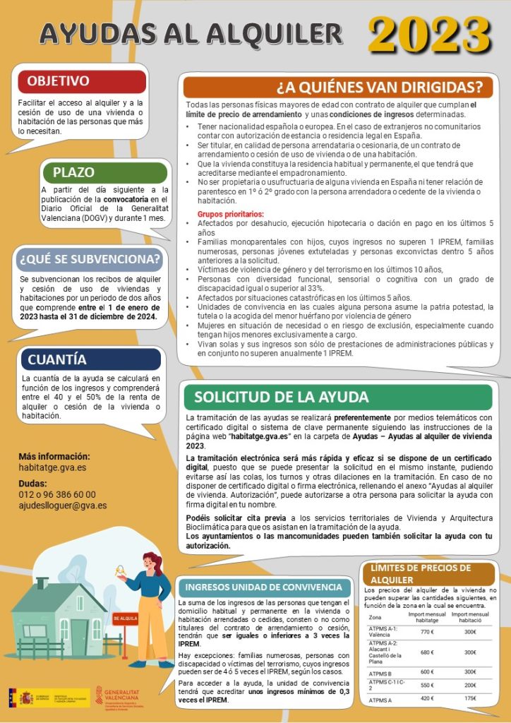 Las ayudas van dirigidas a todas la personas residentes en la Comunidad Valenciana con un contrato vigente de alquiler e incluye el abono de hasta el 50% de los gastos del alquiler de una vivienda o habitación. Los importes que subvenciona son los que van del 1 de enero de 2023 hasta 31 de diciembre de 2024 o desde que se haya suscrito el alquiler después de esa fecha.